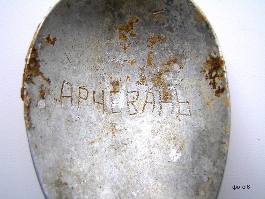 на ручке которой было вырезано Черкашин Андрей И (на одной стороне) и ВВФ-Р (на другой), а в черпачке – Арчевань (название населенного пункта на территории Азербайджана) (фото 4-6).
