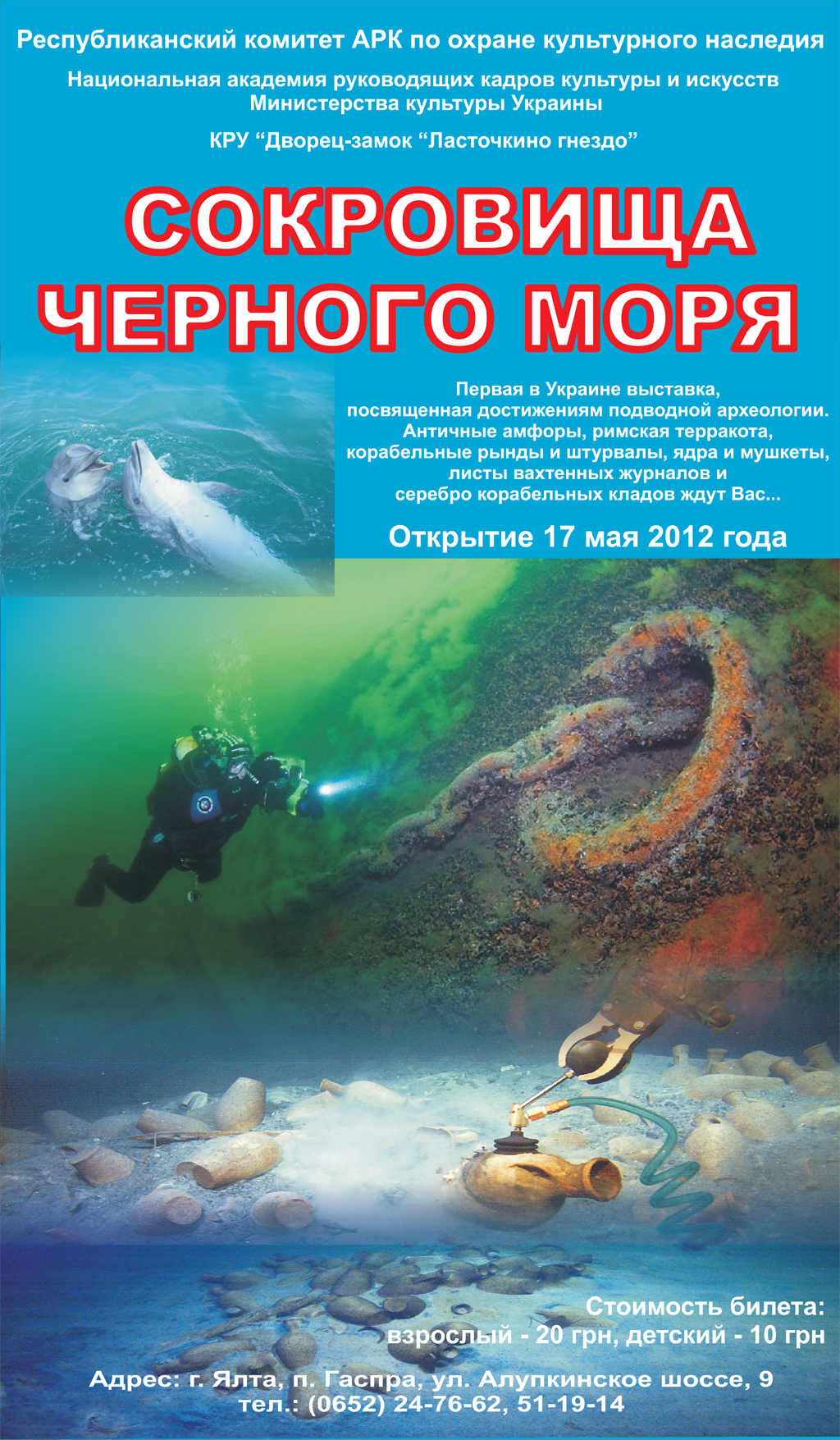 17 мая 2012 года, в Ялте, во дворце «Ласточкино гнездо», состоится открытие первой в Украине выставки подводной археологии «Сокровища Черного моря». По инициативе Крымского правительства, публике представят часть уникальных свидетельств прошлого. Бесценные сокровища науки и культуры в неприкосновенности, сохраненные морем: античные амфоры, римская терракота, корабельные рынды и штурвалы, ядра и мушкеты, серебро корабельных кладов…