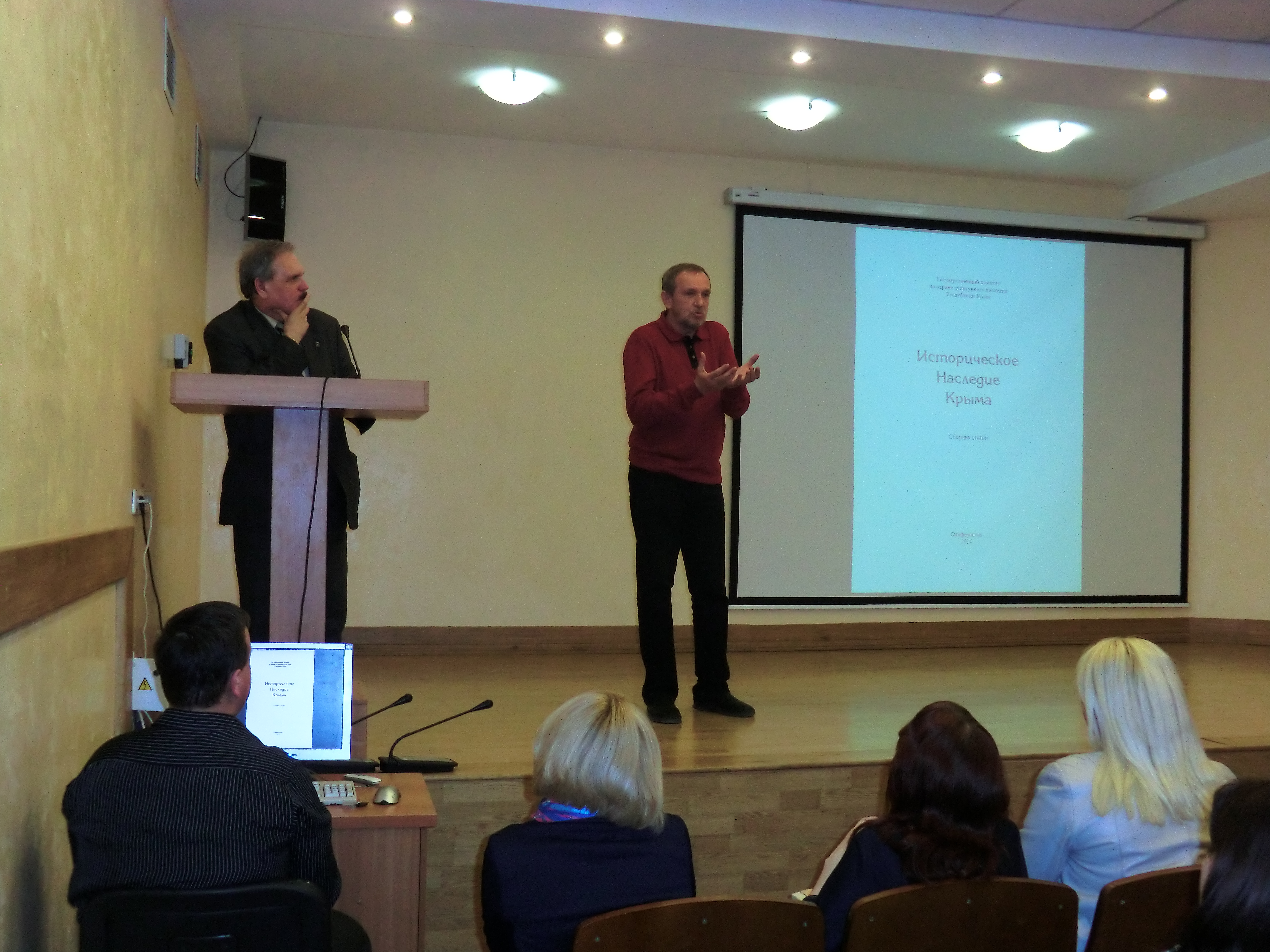Состоялась презентация сборника «Историческое наследие Крыма»На презентации присутствовали: председатель комиссии Государственного совета Республики Крым по культуре и вопросам охраны культурного наследия С.Савченко, члены Крымского отделения ВООПИК во главе с председателем Н.Кармазиной, ученые-историки, археологи, краеведы, педагоги, журналисты, представители научных учреждений, музеев, библиотек, туристической сферы, общественных организаций, редакционная коллегия и авторы статей. В состав редколлегии издания входят 5 докторов наук и 5 кандидатов исторических и филологических наук, директора двух музеев, руководитель НИЦ памятникоохранных исследований и руководство профильного ведомства. Презентация сборника была приурочена к Международному дню охраны памятников и исторических мест. В приветственном слове С.Савченко отметила важность выхода в свет сборника статей «Историческое наследие Крыма» в годовщину «крымской весны». Н.Гриненко поздравила всех присутствующих с праздником, пожелала успешной работы, новых исследований и новых открытий во благо процветания родного Крыма и вручила почетные грамоты членам редакционной коллегии и сотрудникам Государственного комитета по охране культурного наследия. В ходе презентации выступили Зарубин В.Г., Герцен А.Г., Гржибовская Г.Н., Похвалин И.В., Прохоров Д.А., Борисов Д.А., Руев В.Л., Киселев С.Н., Кармазина Н.В. и др. В заключении презентации заместителю директора КРУК РК «Крымская республиканская универсальная научная библиотека им. И.Франко» С.В.Ющенко было передано безвозмездно 70 экземпляров презентуемого издания, который от имени руководства библиотеки поблагодарил Н.Гриненко за возрождение издания «Историческое наследие Крыма» и вручил памятный адрес. С выступлением гл. редактора издания, председателя Госкомитета по охране культурного наследия Республики Крым Н. Гриненко можно ознакомиться здесь