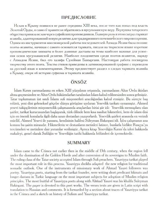 Тексты стихов приведены в латинизированной графике с переводом на русский язык и комментариями. Этому предшествует раздел о тех следах, что оставил тарикат ясавийа в истории Крыма, а также ознакомительный очерк о суфизме, как явлении духовной культуры. Издание предназначено специалистам в области традиционной народной культуры, а так же широкому кругу читателей, интересующихся фольклором и традицией.